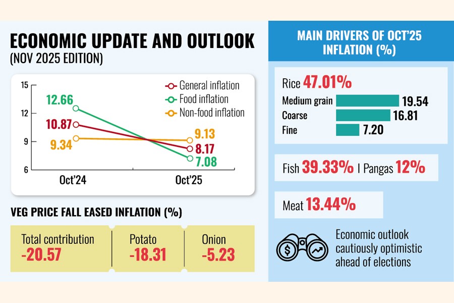 Rice, fish, and meat remained the dominant drivers of food inflation in October, accounting for 99.78 per cent of the total, while a continued decline in vegetable prices helped temper overall price pressures, according to the General Economics Division (GED) of the Planning Commission.