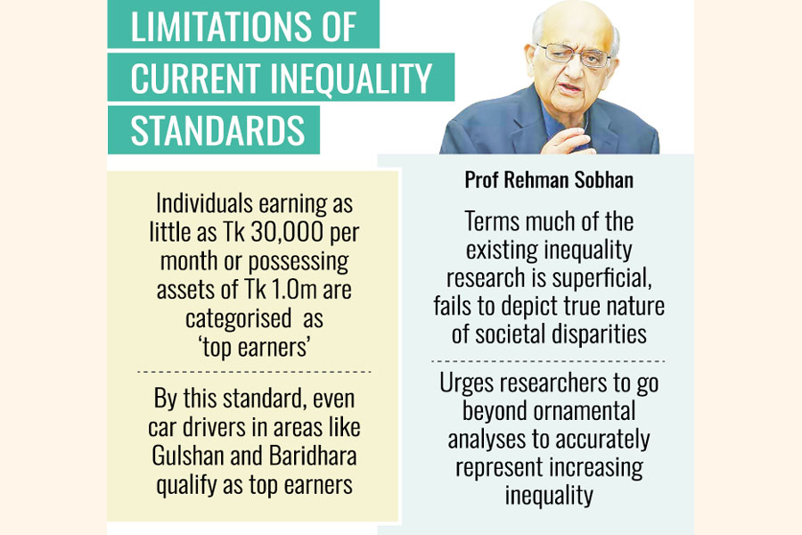He pointed out the limitations of current inequality standards, where individuals earning as little as Tk 30,000 per month or possessing assets of Tk 1.0 million are categorised as 'top earners'.