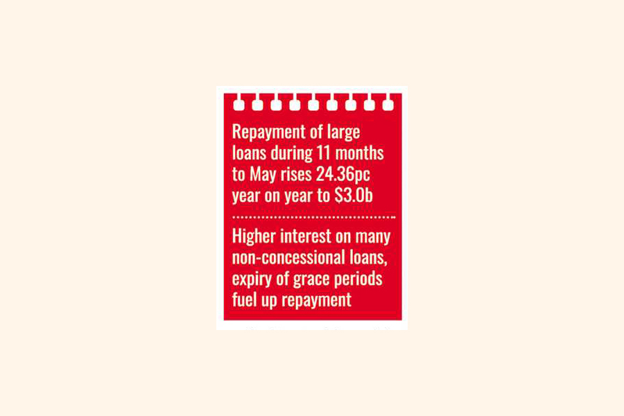 Debt-servicing pressure against large foreign loans taken by Bangladesh builds up as repayment during 11 months to May rose 24.36 per cent, year on year, to US$3.0 billion.