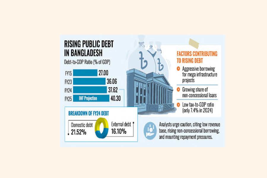 Bangladesh's rising public debt is raising red flags among economists and policymakers, as the debt-to-GDP ratio has climbed nearly 11 percentage points over the past decade, reaching 37.62 per cent in the last fiscal year (FY 2023-24).