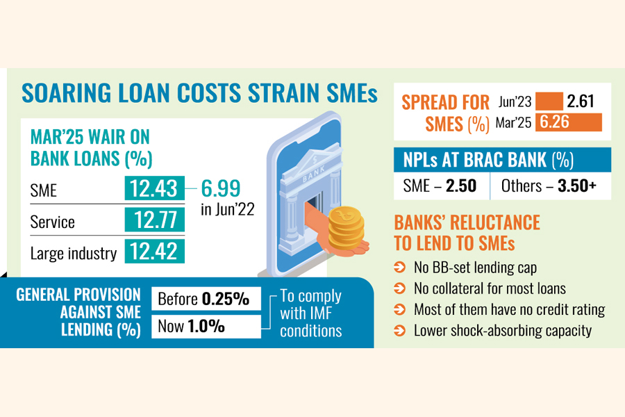 According to the latest major economic indicators released by the Bangladesh Bank (BB), the weighted average interest rate (WAIR) on bank advances for SMEs was 12.43 per cent in March this year, which was the second highest after the service sector (12.77 per cent).