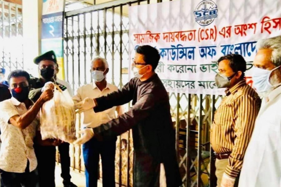 Shippers' Council of Bangladesh distributed 500 (five hundred) packets of food items in presence of State Minister for Shipping Khalid Mahmud Chowdhury, MP and BIWTA Chairman Comdr. Golam Sadek among the jobless port workers in Sadarghat Terminal building in Dhaka on Wednesday. Md. Rezaul Karim, chairman of SCB and Ariful Ahsan, Senior Vice Chairman, Shippers' Council were present.