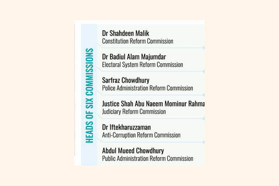 The chief adviser named the names of the chiefs of the rejig commissions. Dr Badiul Alam Majumdar will be the head of Electoral System Reform Commission, Sarfraz Chowdhury will head Police Administration Reform Commission, Justice Shah Abu Naeem Mominur Rahman lead Judiciary Reform Commission, TIB's Dr Iftekharuzzaman will be the head of Anti-Corruption Reform Commission, Abdul Mueed Chowdhury be the head of Public Administration Reform Commission and Dr Shahdeen Malik will head Constitution Reform Commission.