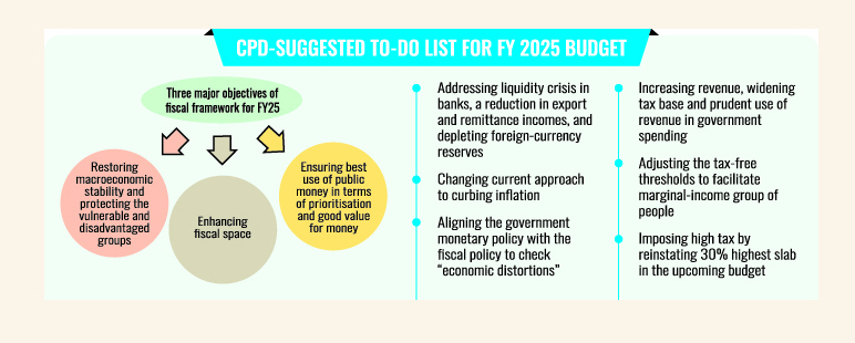 The CPD organised the briefing on "Recommendations for the National Budget for the Fiscal Year 2024-2025," where the researchers stressed the need for focusing on macroeconomic stability in the upcoming budget, containing inflation and checking "price manipulations" of essential commodities.