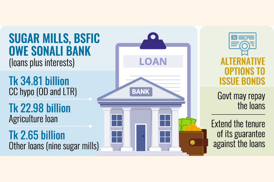 Sonali Bank PLC has requested the government to issue bonds worth Tk 60 billion to settle outstanding loans of the sugar mills and Bangladesh Sugar and Food Industries Corporation (BSFIC) with the proceeds, officials said.