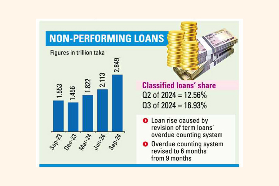 Bangladesh's banking sector sees classified loans make a quantum leap to Tk 2.85 trillion, largely for a redefined default-counting system applicable to term credits that is also revealing 'hidden' debts.