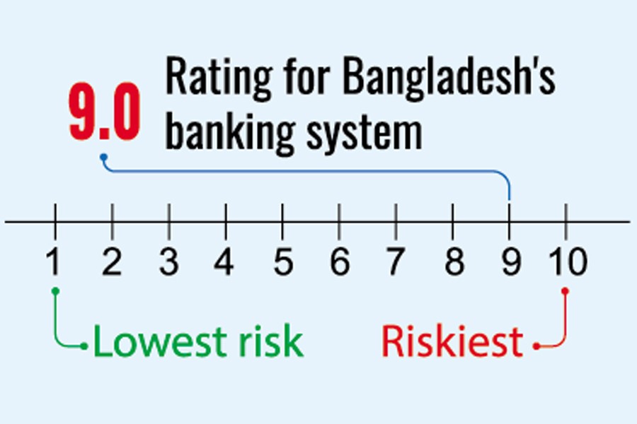 In its latest report released on July 16, the global agency rated Bangladesh's banking system at 9.0 on a scale of 1.0 to 10, where 1.0 denotes the lowest risk and 10 the highest. This places the country's banking industry among the riskiest in Asia and the Pacific region - a position shared with only three other Asia-Pacific economies: Mongolia, Cambodia, and Vietnam.