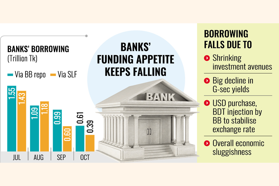 According to BB statistics, the scheduled banks altogether borrowed Tk 1.55 trillion in July, using central bank repo, in the first month of the fiscal year. Since then, the figure kept dropping to record Tk 1.09 trillion, Tk 996 billion and a peanut Tk 616 billion in August, September and October respectively.
