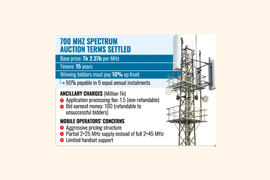 Winning bidders must pay 10 per cent upfront, with the remaining 90 per cent payable in nine equal annual installments. The Bangladesh Telecommunication Regulatory Commission (BTRC) may issue the spectrum-assignment letter upon receipt of the first tranche.