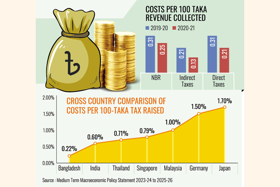 The government spent Tk 0.31 to collect Tk 100 in domestic revenue in the fiscal year of 2019-20, but this fell to Tk 0.25 in 2020-21, according to the Medium Term Macroeconomic Policy Statement 2023-24 to 2025-26 by the Ministry of Finance.