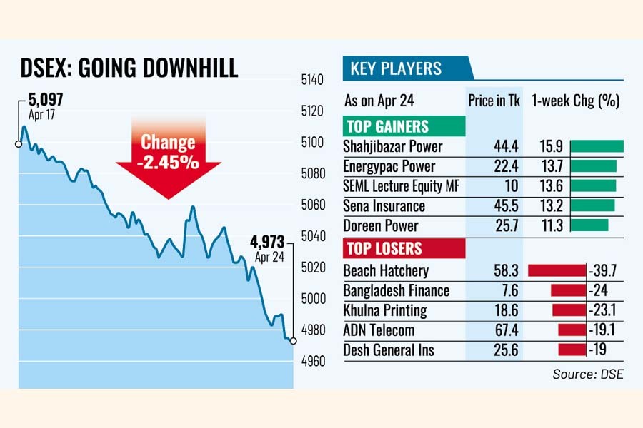 But such initiatives failed to bring any positive result, as the benchmark DSE index slid 125 points or 2.45 per cent this week to settle at 4,973, the lowest in six months.