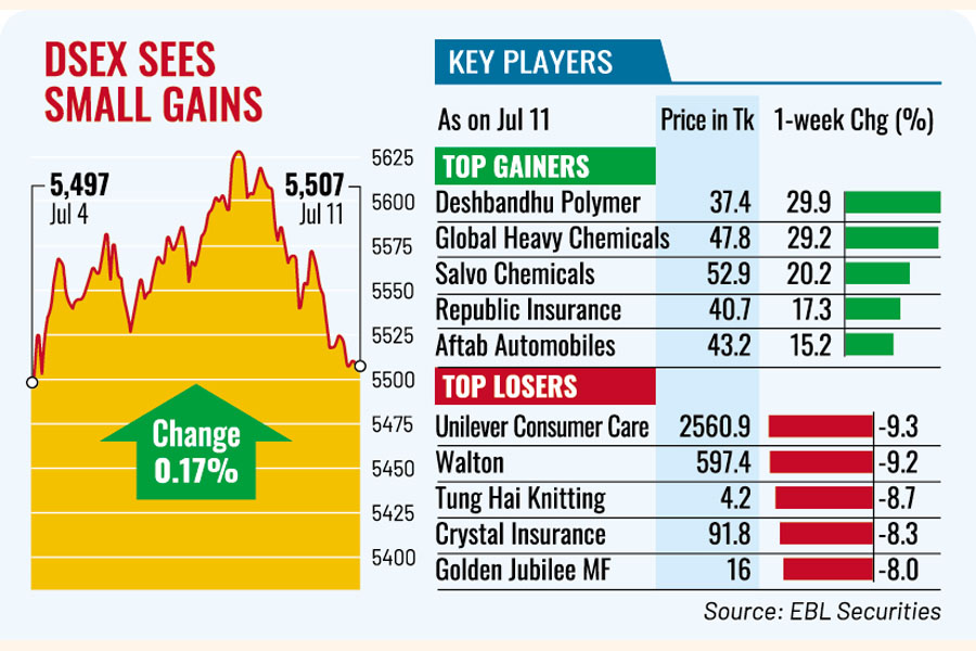 The benchmark DSEX index finally ended the week only 9 points or 0.17 per cent higher at 5,507.