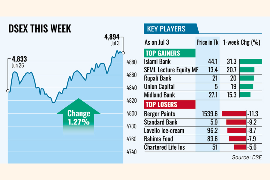 DSEX, the key index of the Dhaka Stock Exchange (DSE), settled the week 61 points or 1.27 per cent higher at 4,894.