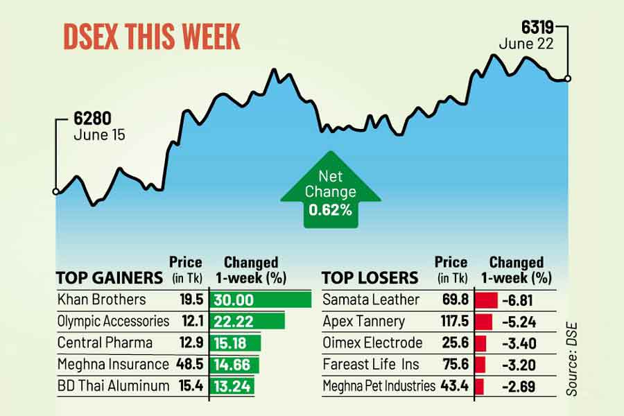 DSEX, the benchmark index of the Dhaka Stock Exchange (DSE), finally settled the week 39.23 points or 0.62 per cent higher at 6,319.25, after losing 72.82 points in the previous week.