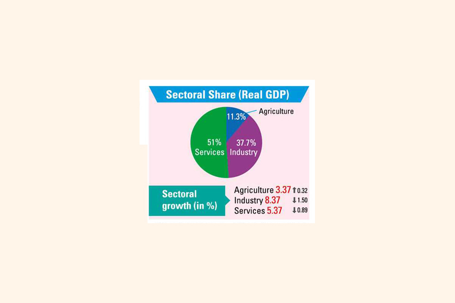 The service sector or the biggest sector of Bangladesh's economy expanded at 5.37 per cent or down by 0.89 percentage points from a year earlier.