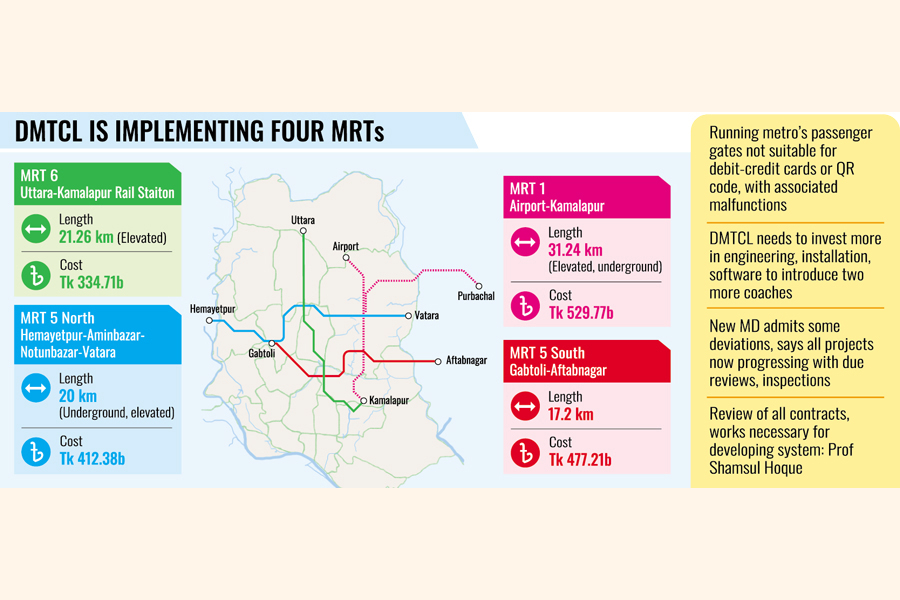 As the lone state-controlled company to plan, build, operate and maintain mass-transit system, DMTCL has now projects costing Tk 1.76 trillion to develop 128.74-kilometre metro network in the city's east-west and north-south corridors. Of these, Tk 334.71 billion MRT 6 from Uttara to Motijheel is under operation after the completion of 20.1- km elevated track and its extension up to Kamalapur rail-station is now underway.