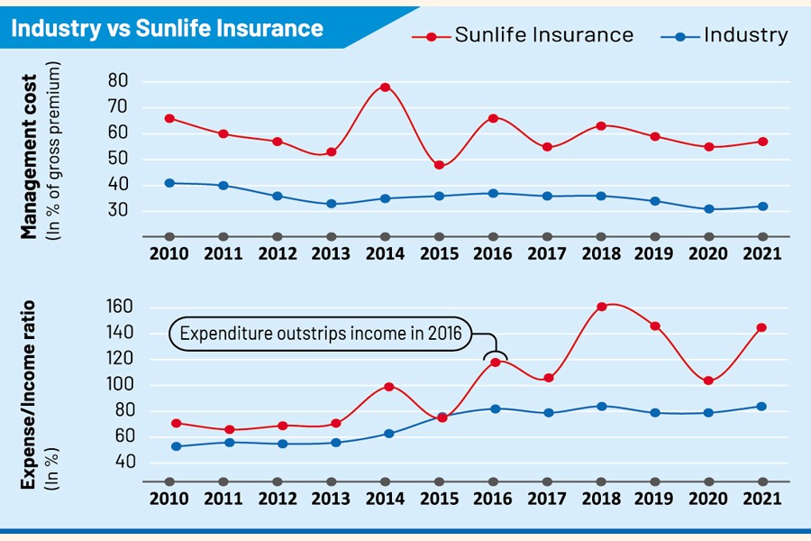 Around the same time, the Sunlife's cost of management was 50 per cent to 100 per cent higher than the industry's. For example, in 2021 the industry spent Tk 32 in management out of Tk 100 earned in gross premium, while Sunlife's management expenditure was Tk 57.
