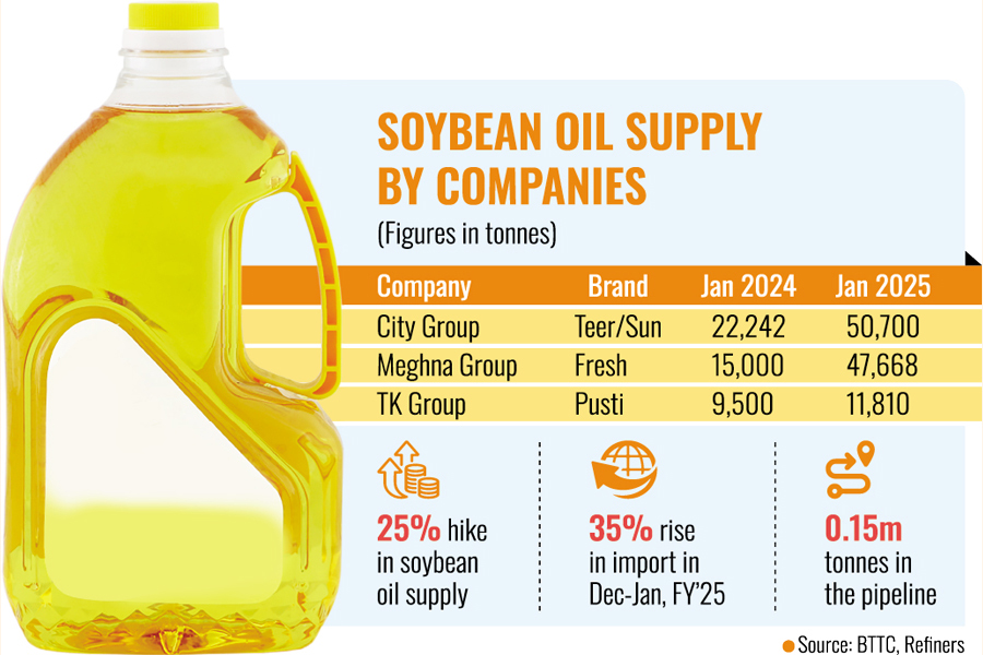 The supply of soybean oil by the leading refiners increased by 25 per cent in January 2025 compared to the same month last year, said businesses at the Bangladesh Trade and Tariff Commission's (BTTC) special meeting on Sunday.