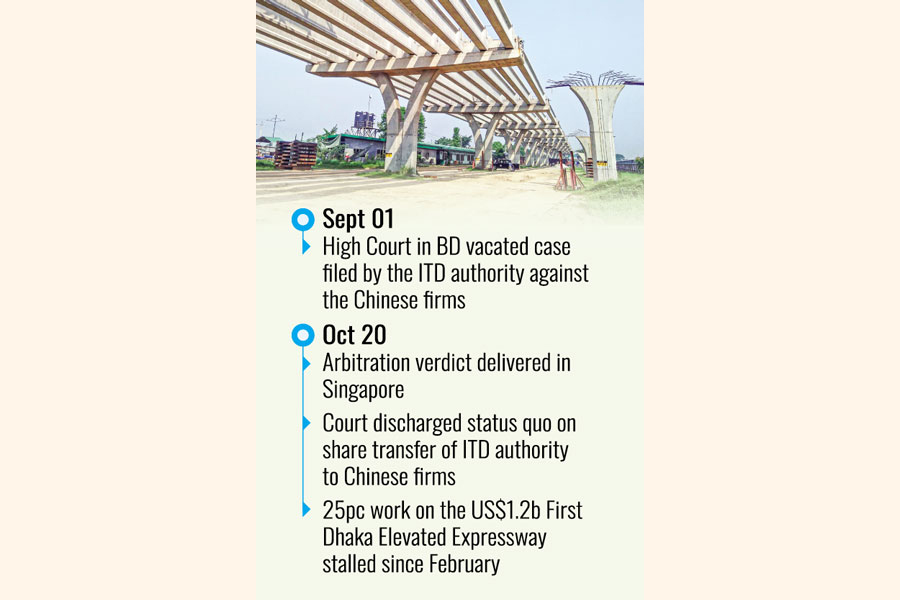 Officials hope the arbitration verdict, delivered on October 20 in Singapore, is likely to mitigate the construction-fund crisis as 25 per cent of works on the US$1.2-billion First Dhaka Elevated Expressway (FDEE) have stalled since last February following continuing disagreement among the shareholders.