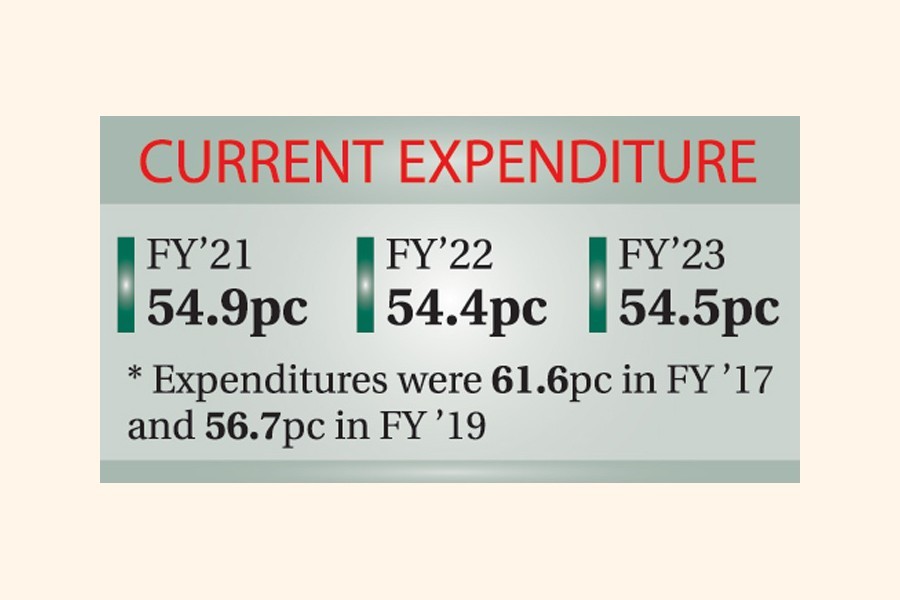 The government looks to reduce the current expenditure in terms of percentage of the total outlay in the next three fiscal years as per the 'medium-term macroeconomic outlook' presented by Finance Minister AHM Mustafa Kamal along with the national budget on Thursday.