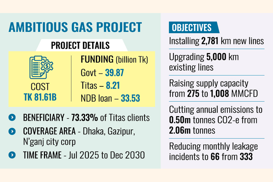 Titas Gas Transmission and Distribution PLC wants to implement an ambitious Tk 81.61 billion project to reduce gas wastage by installing around 2,781 kilometres of new distribution lines and upgrading 5,000 kilometres of existing ones in the Dhaka, Gazipur, and Narayanganj city corporation areas.