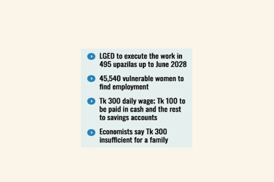 Each woman employed for the job will earn a daily wage of Tk 300, with Tk 100 to be paid in cash and the remainder deposited into their savings accounts through commercial banks, according to a proposal sent to planning ministry.