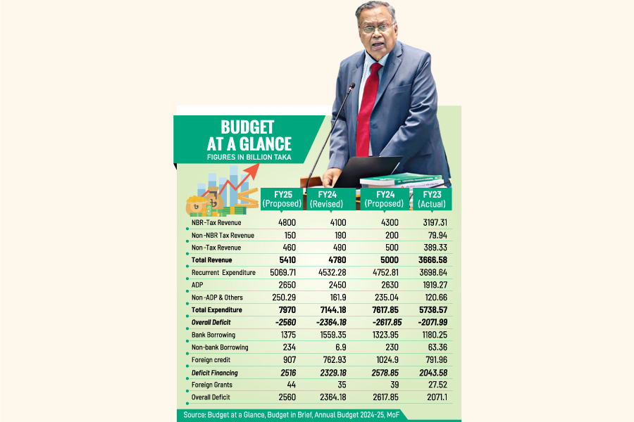 The government estimates aggregate revenue earning worth Tk 5.45 trillion to be pooled from taxes and non-tax sources. The arithmetic leaves a deficit of Tk 2.56 trillion, which has to be managed by borrowing mainly from banking system.