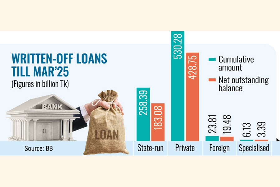 The net outstanding balance of written-off loans till March 2025 stood at over Tk 634.71 billion, with the individual amount at state-owned commercial banks, private commercial banks, foreign commercial banks, and specialised banks standing at over Tk 183.08 billion, over Tk 428.75 billion, over Tk 19.48 billion, and over Tk 3.39 billion, respectively.