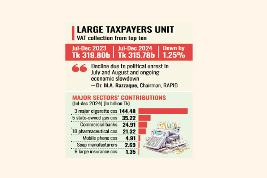 Collection of value-added tax (VAT) from the top 10 corporate taxpayers declined by Tk 4.0 billion or 1.25 per cent in the first half (H1) of the current fiscal year (FY 2024-25) from the same period of last FY.
