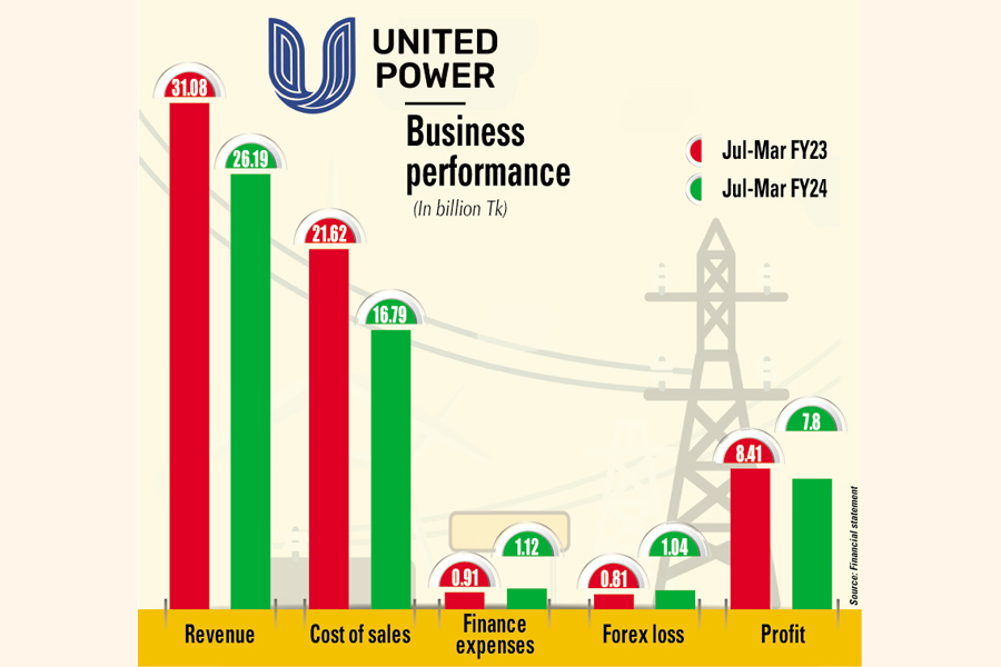 United Power's nine-month profit dropped almost 7 per cent year-on-year to Tk 7.80 billion through March this year. The decline in profit was accompanied by a 16 per cent fall in revenue to Tk 26.19 billion during the time.