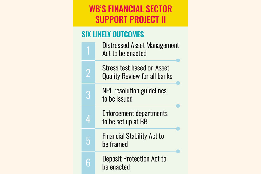 Under the proposal, Bangladesh will achieve at least six outcomes that include enacting Distressed Asset Management Act (DAMA) and stress test based on AQR (Asset Quality Review) for all the scheduled banks within the second and third years of the project.