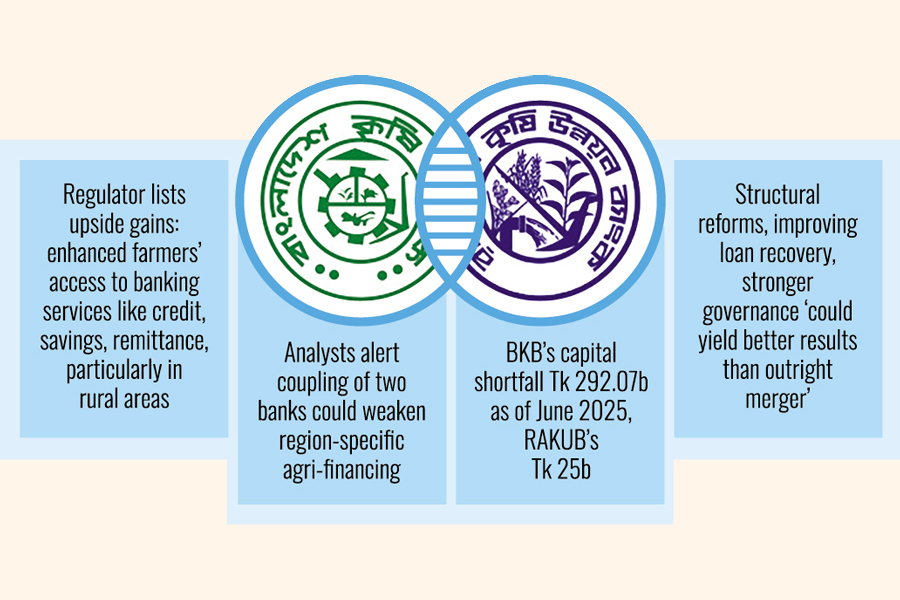 A government move for the merger of Rajshahi Krishi Unnayan Bank (RAKUB) with Bangladesh Krishi Bank (BKB) stokes fear it could weaken region-specific farm financing and create new operational challenges instead problem solving.