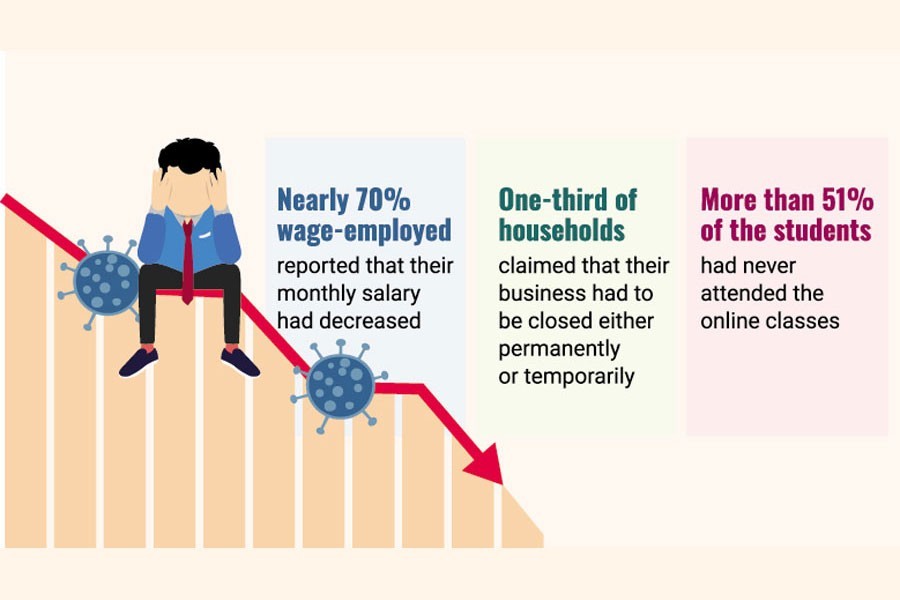Sharing the outcomes, SANEM research economist Mahtab Uddin said some 69.76 per cent wage-employed respondents reported that their monthly salary had decreased while 4.52 per cent of the surveyed respondents reported that the main earning member had shifted to a different profession either because of low wage or wage cut or loss of employment.