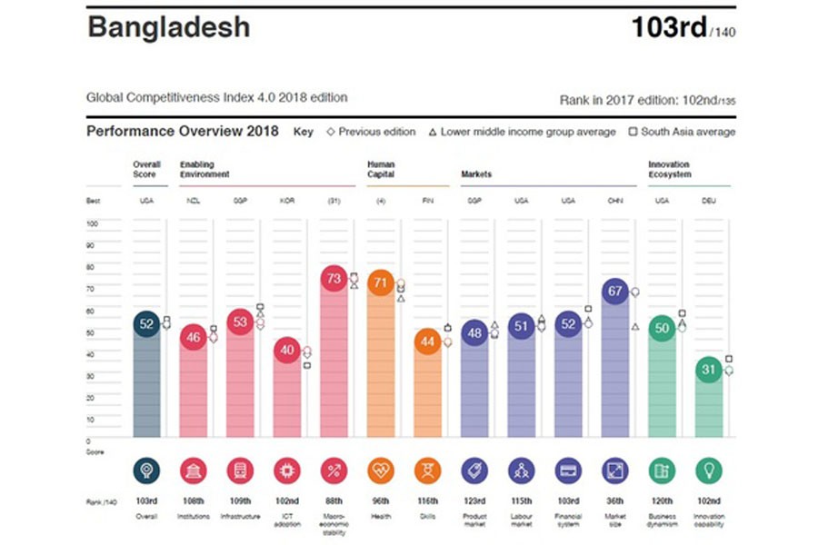 Bangladesh has not been able to make much headway in a number of areas that are important in improving a country's ability to compete. The government has taken some policy measures to improve the situation, but those are yet to show results. The country's scorecard in areas of institutions, infrastructures, ICT adoption, skills, banks' soundness, business dynamism, innovation etc., is not encouraging.