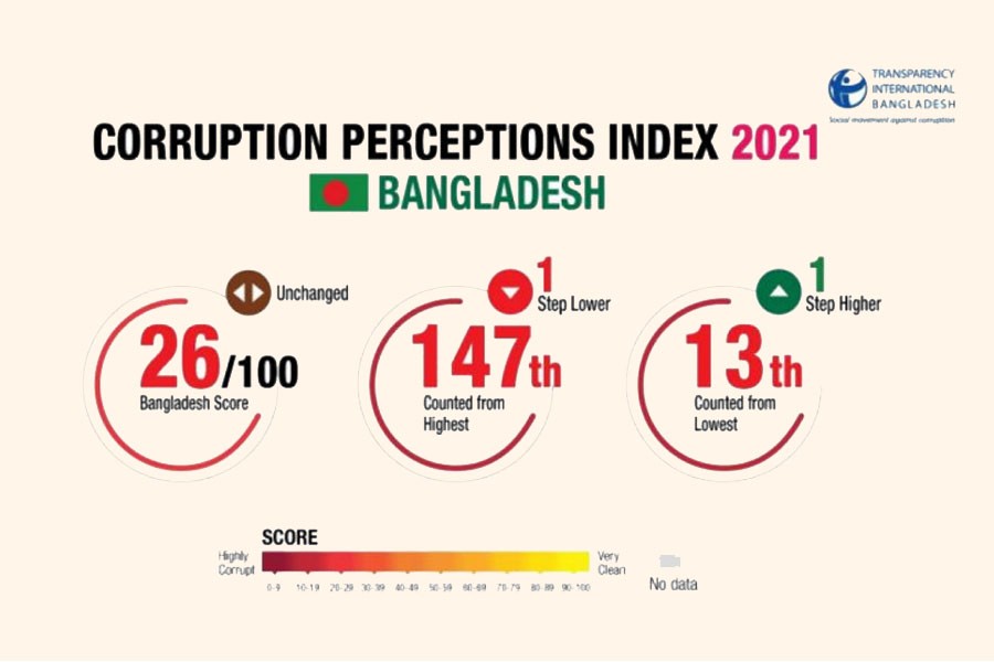 Bangladesh's static position in the Berlin-based Transparency International's Corruption Perception Index (CPI) for the past four years does not particularly make the country proud. It fares only better than Afghanistan, a war ravaged country and in unrelenting turmoil, among the South Asian countries. But here is a country that has been doing far better than any of those countries in terms of most of the development parameters. If this is not enough to highlight the incompatibility between a rising economy that propels it on course of achieving the enviable status of a developing country and the CPI rating, the declared policy of zero tolerance to corruption from the highest ruling echelon should have made the situation better. The truth is that the ordinary citizens of the country are not corrupt, nor are they in a position to abuse power or take undue advantage of public resources. It is the educated, privileged, influential people in administrative or representative positions who gain illegal wealth by foul means.