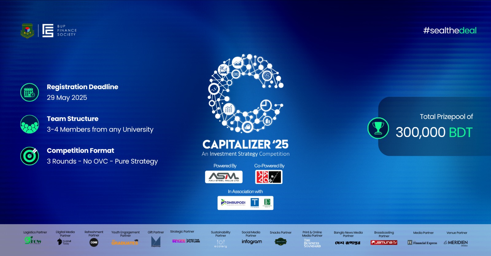 A total prize pool of BDT 3,00,000. The Champion takes home BDT 1,50,000. The First and Second Runners-Up collect BDT 90,000 and BDT 60,000, respectively.