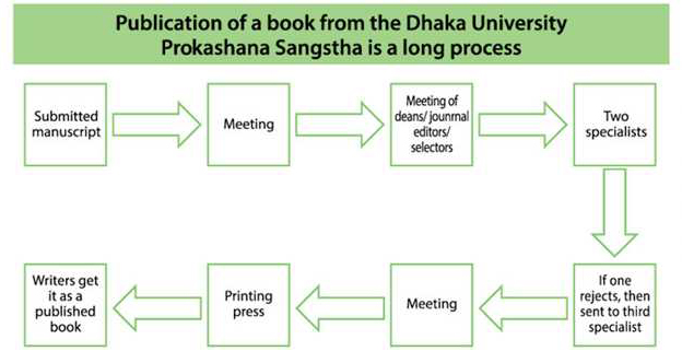 However, if a writer publishes a book from this publishing entity, he or she has to face a long period. It is an arduous process to publish a book. First, the writer must submit the manuscript with an application to the director of DU publisher. After that, DU publisher calls a meeting, then again a meeting of deans or various journal editors or selectors; if the selectors select this copy, the copy is sent to specialists for review. Only if both of them accept the copy then is it permanently selected.