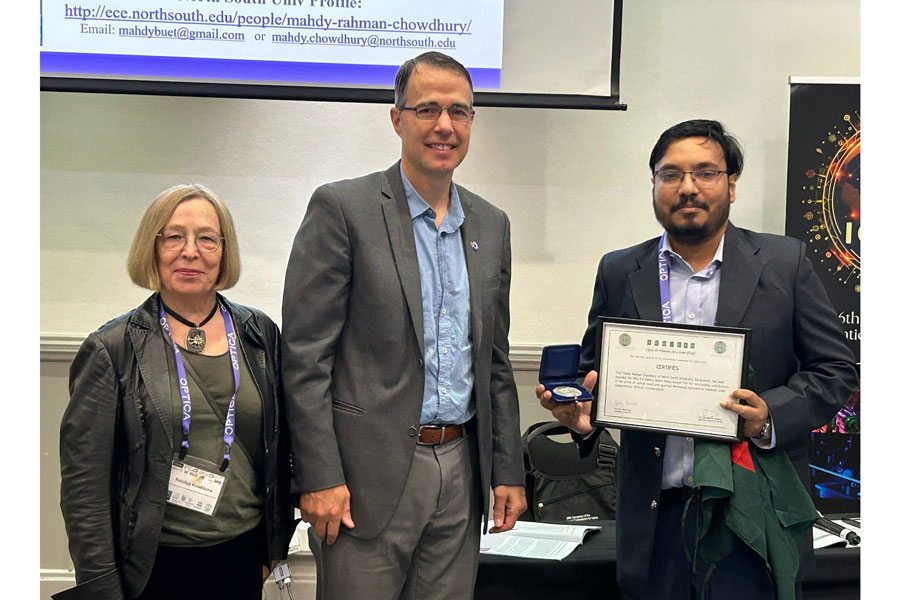 Dr Mahdy Rahman Chowdhury, Associate Professor of Electrical and Computer Engineering at North South University (NSU), has been awarded the prestigious Galileo Galilei Medal at the 26th International Commission for Optics (ICO) Conference, recognizing his significant contributions to optical and quantum mechanical manipulation. Dr. Mahdy is the first Bangladeshi to receive this globally acclaimed award, earning his place in the esteemed ICO Golden Book, says a press release.