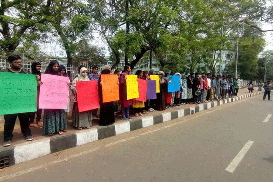 The protest came a day after five law department students were seriously injured during an attack allegedly by a group of Chhatra League leaders and activists.