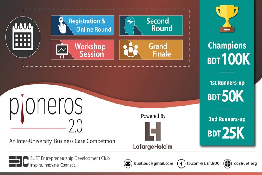 In today's dynamic world, no one, especially the youth, should keep their knowledge and expertise limited to a single field. By keeping the line in mind, Bangladesh University of Engineering and Technology Entrepreneurship Development Club (BUET EDC) launched 'Pioneros' in 2016, and it was sponsored by Lafarge Surma Cement Limited. It was a business case competition which aimed to introduce BUET students to the corporate world and provide a first-hand experience in solving real-life business problems.