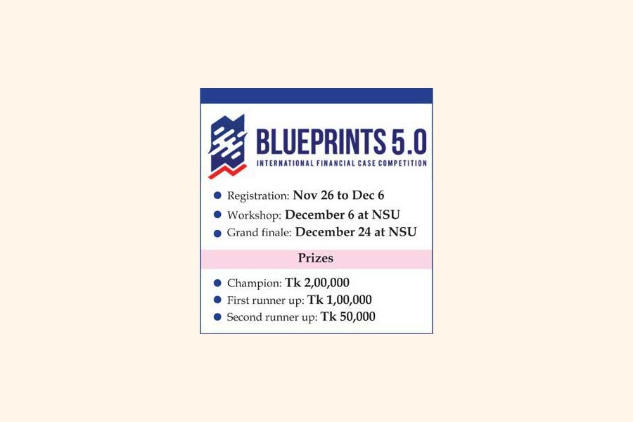 The grand finale of Blueprints 5.0 will be held at North South University premises on December 24, where many significant and influential individuals from the financial sector of Bangladesh will be present. Since its foundation in 2014, NSU Finance Club has successfully coordinated national and intra-university competitions and events. The club's goal is to develop the skills of undergraduate students and bridge the gap between them and the corporate world.