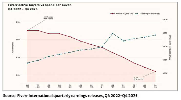The platform numbers tell an uncomfortable story: The headline figures are not ambiguous. Fiverr's active buyer count has fallen every quarter since its peak of 4.3 million in late 2022. By the end of 2024 it had slipped to 3.6 million, a 10 per cent year-on-year decline, and by December 2025 it had contracted further to 3.1 million, representing a loss of roughly 1.2 million buyers in three years. The company's total revenue has held up, not because more people are buying, but because those who remain are spending considerably more: spend per buyer rose from around US$ 242 in early 2023 to US$ 342 by the close of 2025, a 41 per cent increase over the same period in which the buyer base shrank by more than a quarter. The two trends together describe a marketplace thinning at its base whilst consolidating at the top, which is precisely what one would expect when artificial intelligence absorbs the most commoditised work and leaves only the complex commissions behind.