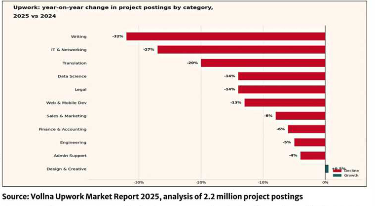 Writing, translation and administration— the first wave of casualties: The Upwork postings data makes the sectoral damage legible with some precision. Writing was the hardest hit category of all, with project postings falling 32 per cent year-on-year in 2025, the sharpest single-category decline on the platform. IT and networking work contracted by 27 per cent, translation by 20 per cent, and web and mobile development by 13 per cent. Legal, data science, and sales and marketing all recorded declines in the six to 14 per cent range. These figures are drawn from an independent analysis of 2.2 million project postings on Upwork and are consistent with the academic literature. A study published in Organisation Science and summarised by the Brookings Institution found that freelancers in occupations most exposed to generative AI experienced a 2.0 per cent decline in contracts and a 5.0 per cent fall in earnings following the proliferation of AI tools after 2022, with the effects, counterintuitively, most pronounced among experienced, higher-earning practitioners.