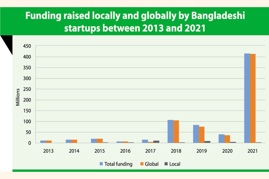 The amount of funds raised by the startups in Bangladesh in 2021 has been presented in the chart based on data from Lightcastle Partners and 'Bangladesh Startup Funding Report 2021' by Future Startup.