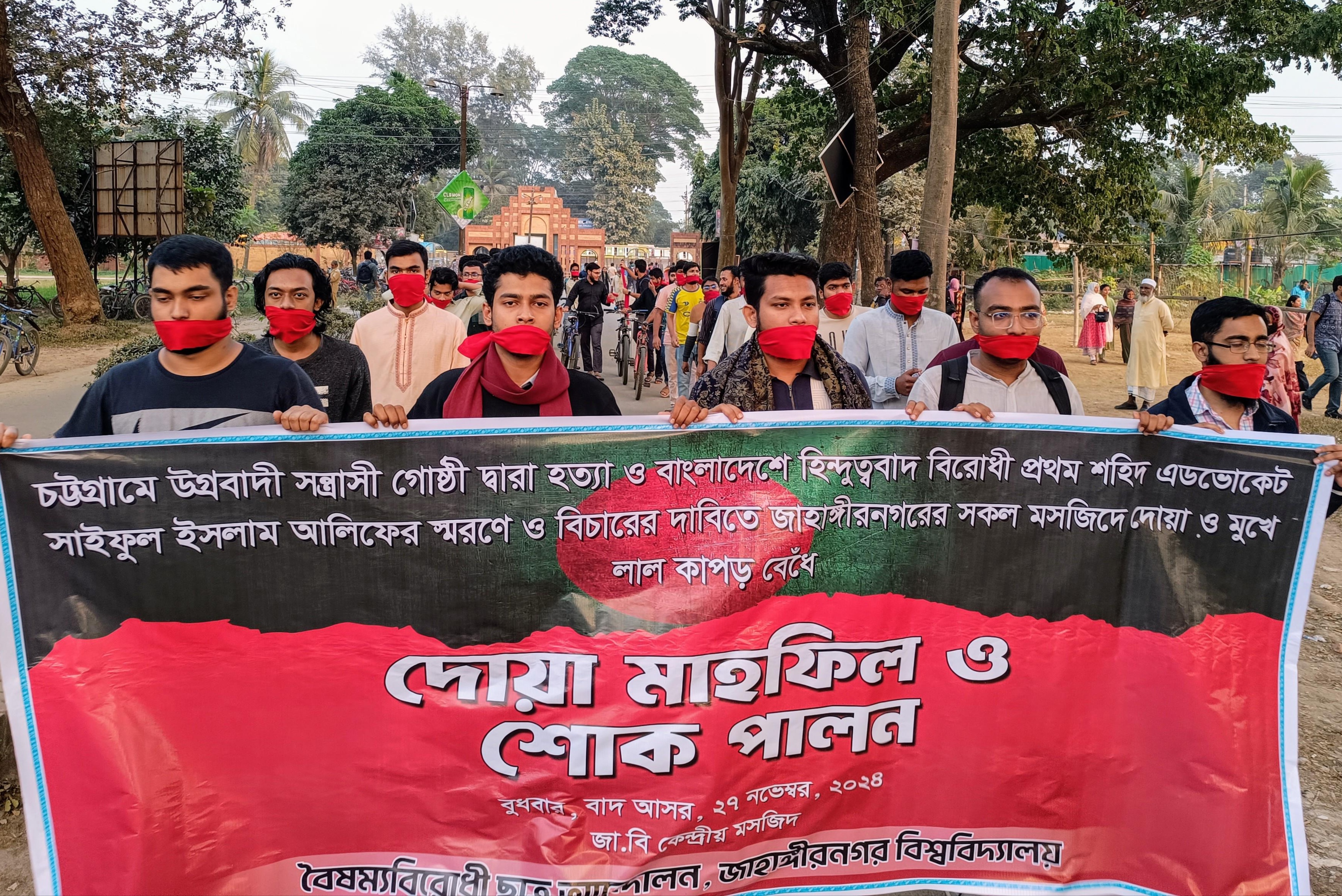 On Tuesday night, hundreds of students staged a protest condemning the alleged attack in the Chattogram court area and the death of lawyer Saiful Islam Alif. The demonstration started around 8:30 PM at Bot-tola and continued across the campus, culminating in a rally at the Shahid Minar. Protesters demanded an immediate investigation into the incident and called for a ban on ISKCON in Bangladesh, accusing the organization of promoting Hindutva extremism.