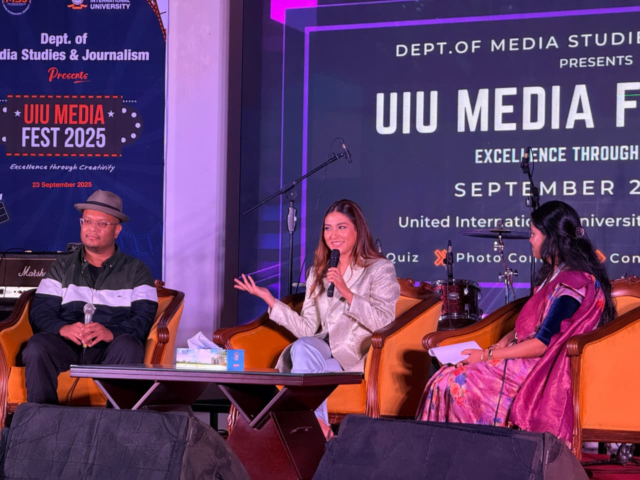 One of the most anticipated sessions, 'Star Talk', featured actress Mehazabien Chowdhury and filmmaker Maksud Hossain, followed by content creator Kaarena Kaiser and filmmaker Shankha Dasgupta. Lecturer Kazi Kamrun Nahar interviewed the first pair. Mehazabien shared childhood memories of how she dreamt of being famous one day. Maksud Hasan, director of 'Saba', which is releasing on September 26th, briefly discussed the film's premise. He'd been working on the idea for six years.