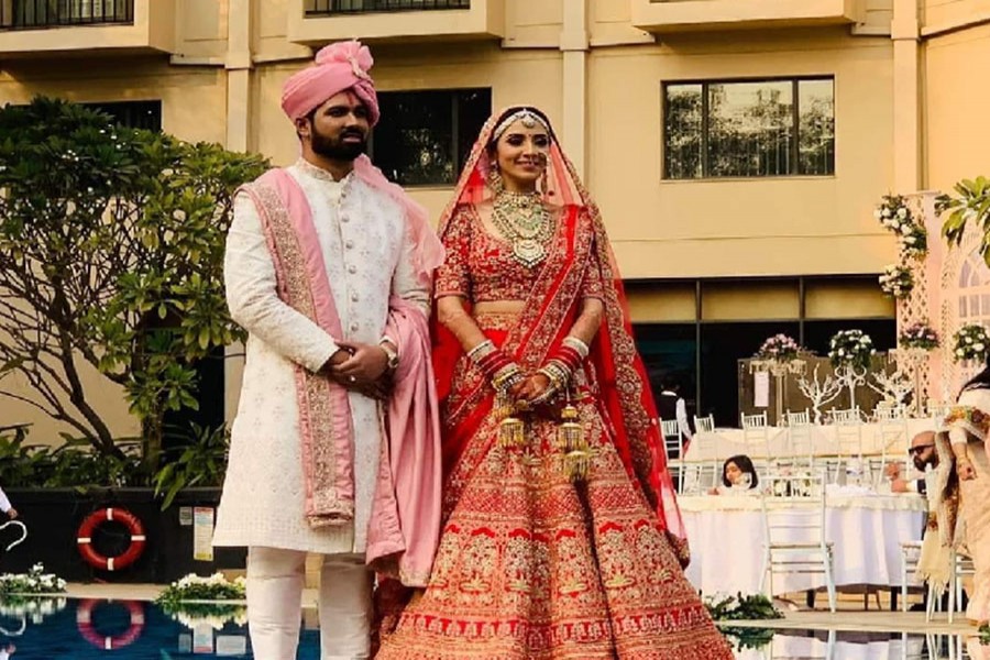 In the photograph, Mim was seen wearing a red Benarsi lehenga with red and white bangles, fully dressed as a bride with a nose ring and a silver tikli on her forehead. The groom wore a white and pink traditional ensemble.