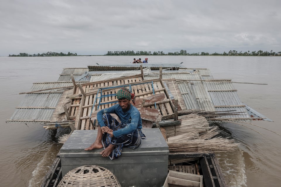 Hashem Ali, cousin of Kosim Uddin, 50, sits on a box as a boat carries the house to another island in the Brahmaputra River, with the current one on the verge of being destroyed by erosion, in Kurigram, Bangladesh on June 20, 2024 — Reuters/File
