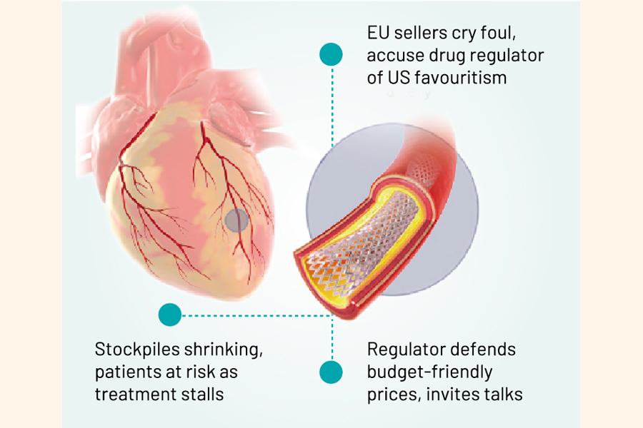 "We are now using our dwindling stock of stents as there is no fresh supply of EU products after the price cut," said Dr Kamrul Hasan, acting director of the National Institute of Cardiovascular Disease (NICVD).
