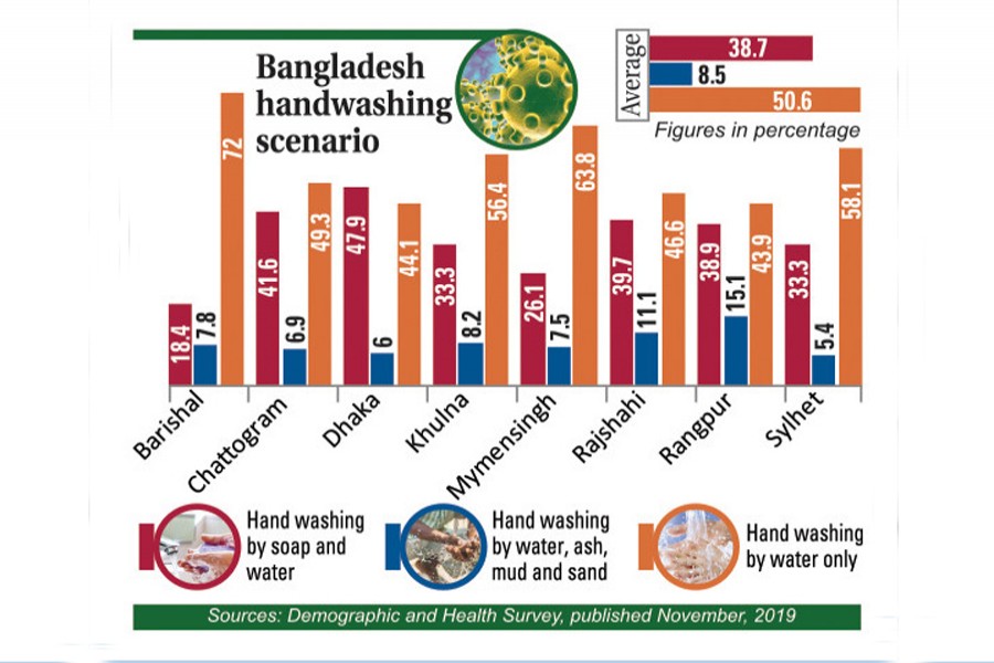 Members of more than 61 per cent households, on an average, in Bangladesh do not use soap with water to cleanse their hands, although the picture has radically changed in recent weeks following the outbreak of COVID-19, a disease caused by deadly coronavirus.